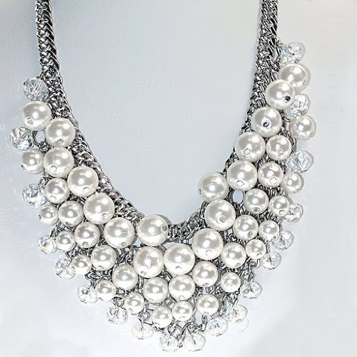 DESCRIPTION FOR THE NECKLACE: Lobster Clasp; DIMENSIONS: Crystal & Faux Pearl Bib Width: 1.25"; Bib Length 7.5"; Total Adjustable Length: 1.5"-18.5" DESCRIPTION FOR THE EARRING: Dangling with Faux Pearl & Clear Crystal