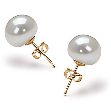 You probably won't find another pair of white pearl earrings like these at a better price anywhere. When you think of pearl earrings, these are what come to mind - classic and glamorous, you will choose these earrings more often than any others in your jewelry collection. This earring set showcases white freshwater 9 to 10mm pearls and is an overall AAA quality - combining outstanding AAA luster, unique button shape and AAA body.Each pearl is mounted on a 14K yellow gold post to showcase the best of each individual pearl. Included are matching butterfly backs to secure the earrings. Your earring set will be carefully packed and shipped to you in an elegant velvet lined box and accompanied by lots of free extras (please see below).And, if you choose, we would be delighted to gift wrap your earring set and turn this earring set into an unforgettable gift.