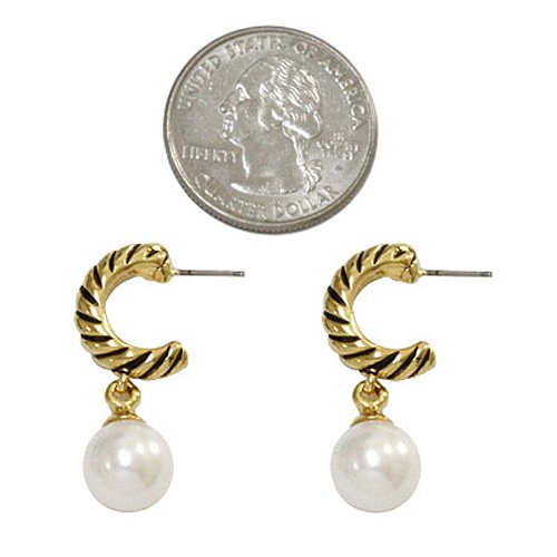 This is a pretty pair of goldtone pearl cuff post earrings. This little half hoops have a twist design on them and a single faux pearl dangling down! They are a great accent to any look! Earrings come to you in a foil gift box though may be a different box color than the one shown.