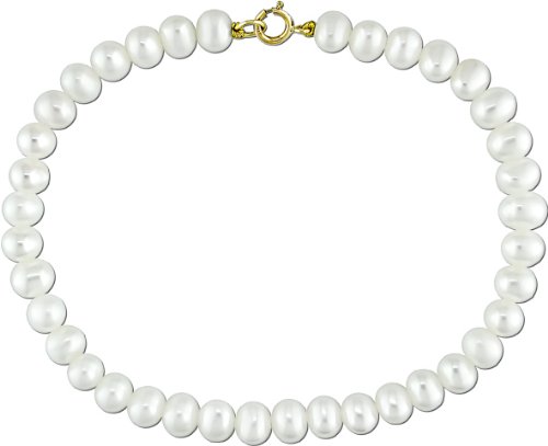 This 7-inch bracelet features a single strand of off-round white freshwater pearls (4-5mm, grade AAA) secured with a 10K yellow gold spring ring clasp.