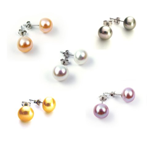 This is such a bargain, You'll have pearls to match every outfit with this set of five multicolor freshwater pearl studs. This features 5 fablulous sets of lustrous, rounded surface, button-shaped 8-9MM cultured pearl earrings that include white, pink, lavender, gray, and golden color. They are set on sterling silver posts and fasten with friction back closures.