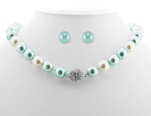 - Formal aqua, light blue and white colored pearls with silver magnetic clasp with rhinestones