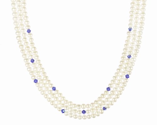 For a classic look, the Gold Over Sterling Silver Three-Row White Freshwater Pearl Chain with Swarovski Elements September Birthstone Necklace features a triple dose of smooth freshwater-cultured pearls. The classic pearls are accented by Swarovski crystal beads with a sapphire-colored hue. The bicone-shaped beads provide a dash of color and celebrate your birth month in style. Whether you're shaking it up on the dance floor or sitting pretty at dinner, this necklace will stay in place as it's secured by a gold-plated sterling silver fishhook clasp.