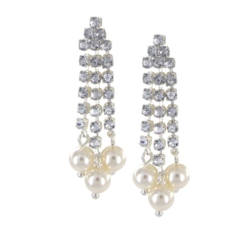 Choose an elegant and glamorous look with these Crystal Rhinestone and Cream Simulated Pearl Drop Earrings. A small pyramid of crystal rhinestones in four-prong settings leads to three trails of crystal rhinestones that stream down to three 6-mm cream simulated pearls. The net effect is like an ornate chandelier that has great contrast between the faceted crystal rhinestones and the smooth, lustrous surface of the simulated pearls. A refined touch of glamor, these drop earrings are certain to dazzle at your next gala event.