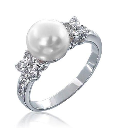 Lusciously romantic. Our Flower CZ Diamond Pearl Engagement Ring is that inexpensive ring that you want to buy when you want a luxury look and a discount price. This charming cz engagement ring features a lustrous 8mm pearl framed by two delicately shaped cz diamond flowers. Pearl engagement rings are for those special people who love a ring with vintage style and timeless tradition. A flower engagement ring is unique and elegant. Buy this irresistible ring today as an engagement ring or promise ring and personalize it with a maximum of 10 characters.
